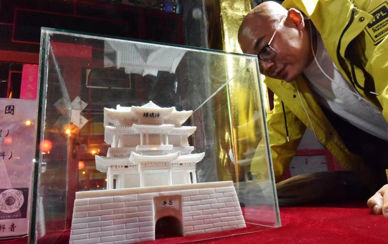 一名游客被一件缩微版清远楼玉雕吸引 陈晓东 摄